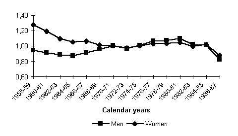 It is frequently stated in professional literature that a fall and a rise in mortality in the period of study fall on the same age groups. It is essentially correct if we consider aggregated age intervals such as children, middle-aged and able-bodied persons, old men, etc. However, if we look carefully at one-year age groups we shall see that a decline and a subsequent rise in mortality do not fall on exactly the same ages. The mortality increment in the 1990s shows a certain systematic bias to the right, towards the older ages, relative to the comparative decline of the 1980s (Fig. 5). It could be reasoned that the mortality crisis affected prepension age groups in the first place, and that would have led us to far-reaching socioeconomic conclusions about factors and implications in no way connected with the previous decline period. (It is a widely held view that persons of prepension age are perhaps the main victims of reform.) But are not such conclusions too hasty?