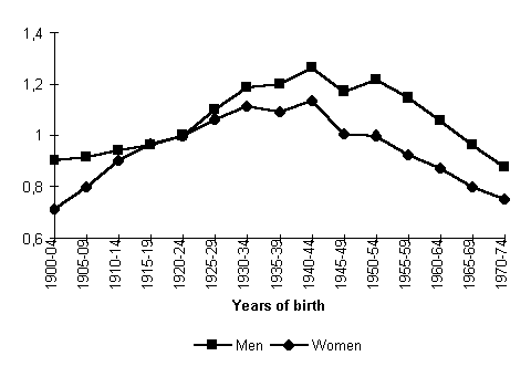 Another hypothesis may be advanced which no doubt must be verified but whose logic seems to explain the similarity of the cohort effect found in different countries. The cohorts born in the 1950s are children of those who were born during the grim period of the late 1920s or early 1930s. In the West it was a terrible economic crisis, and in Russia, the even more dreadful collectivization and famine. The fact that the 1920s-1930s cohorts in many countries display higher mortality suggests that the historical circumstances of their birth were very unfavorable.