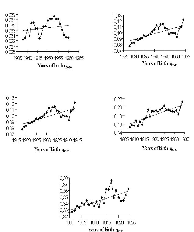 | Year of birth cohort | q 20-30 | q 30-40 | q 40-50 | q 50-60 | q 60-70 |