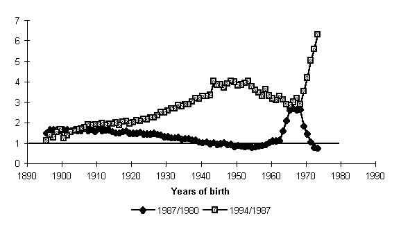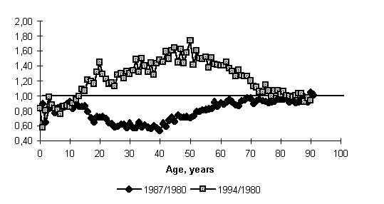 Now, let us turn to two distinct periods-a decline in mortality in the mid-1980s and a growth in the early 1990s-and compare the variation in age-specific mortality rates at two comer points, 1987 and 1994, relative to those in the base year, 1980. The reason for choosing 1980 as the base of comparison is that the mortality rate and its age profile at that particular point in time were undoubtedly the result of development of natural long-term trends, unaffected by the government's purposeful efforts to influence it.24