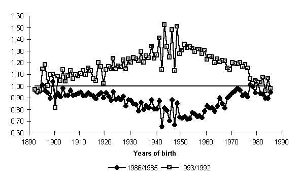 Figure 7 shows annual rates of decline and rise in mortality in one-year cohorts which were achieved in the peak years of decline and rise of total mortality, 1986 and 1993, respectively. Absolute symmetry in cohort mortality decline and growth is undisputable, even though the cohort dichotomy is somewhat higher in the 1990s.
