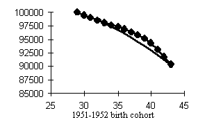 Let us ask ourselves, how would the survivorship of cohorts have changed if the age-specific mean death probabilities of the 1978-1980 had continued throughout the subsequent period. Let us then compare the predicted numbers of survivors and the accumulated numbers of deaths by cohort with available statistics. Our results for males look staggering even to a population scientist who has had enough experience with this kind of data.