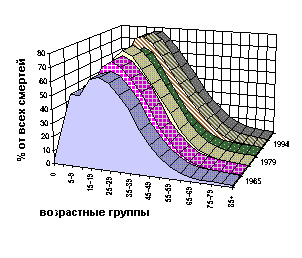 (в 1965 он приходился на возрастную группу 30-34 года). Пик смертности