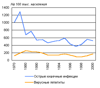 инфекциями, на 100000 населения, Россия, 1970-2000