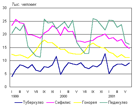 инфекциями, тысяч человек, по месяцам 1999-2001
