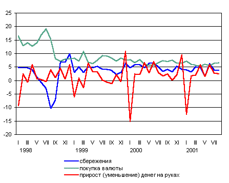 денег на руках, по месяцам 1998-2001, в процентах