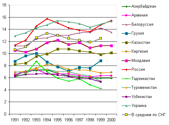 десятилетии (13 умерших на 1000 населения в среднем по странам СНГ).