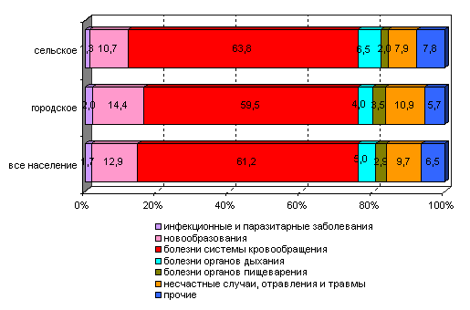 кровообращения и дыхания, в городской же чаще умирают от новообразований,