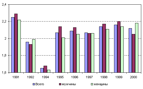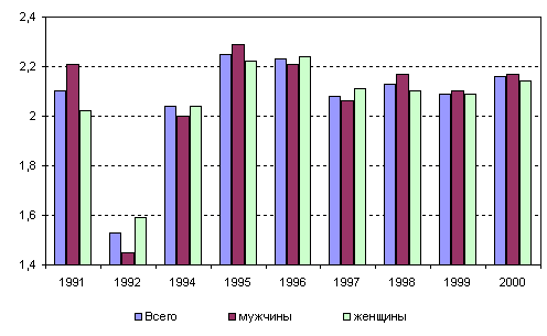 в том числе для мужчин - 0,94, для женщин - 0,90. За период с 1991 по 2000 годы