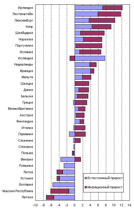 2). Наиболее значительно выросло население Ирландии (12,2‰) и Люксембурга