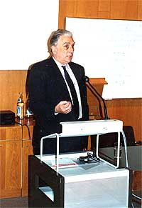 | Леонид Абрамович раздумывает над аргументами оппонента | Выступление на международной конференции. 1998 г. |