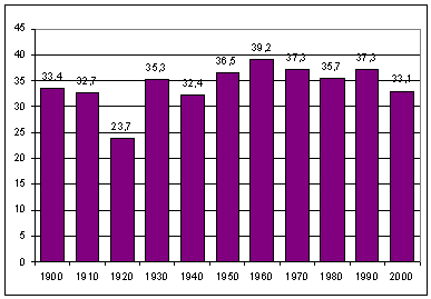 в возрасте 30 лет, (в годах) на протяжении ХХ века