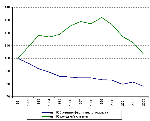 в 2,5 раза - с 90 на 1000 женщин фертильного возраста в 1991 году