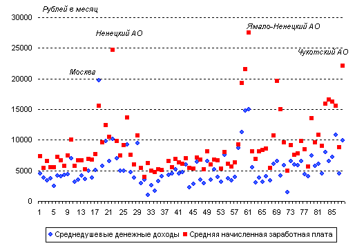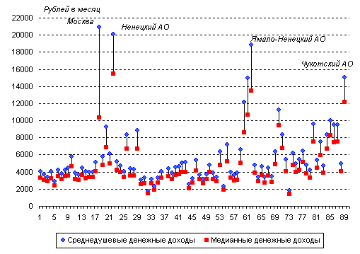 медианными денежными доходами в 2004 году отличались Ямало-Ненецкий