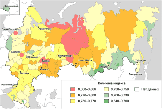 Россия. Около 15% населения страны живет в субъектах РФ со значениями