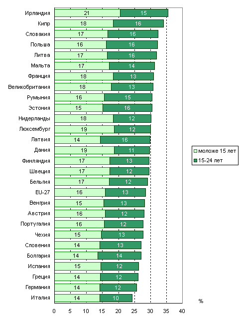 15-24 лет характерны для Венгрии (21,2%), Болгарии (23,0%), Польши
