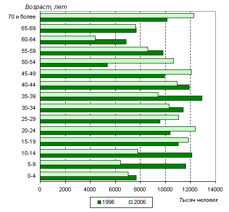 в 2006 году по сравнению с 1996 годом, число людей 45-49 лет и 70