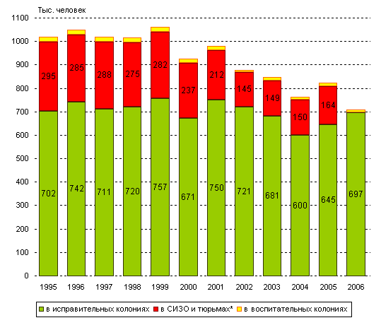 | На начало 2007 года в местах лишения свободы содержалось 872 тысячи человек, в том числе 19,3 тысячи несовершеннолетних
