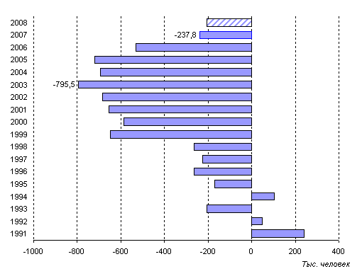 Рисунок 2. Прирост (убыль) населения России, 1991-2008