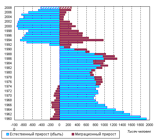 России, 1960-2008 годы, тысяч человек