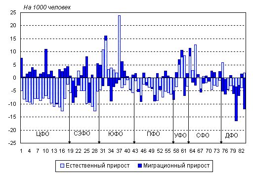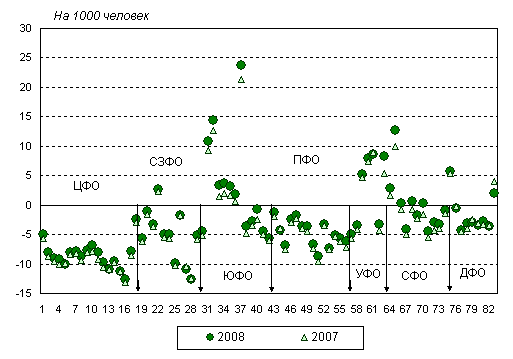 превышала средний по России уровень (-3,7‰) в 39 регионах, причем