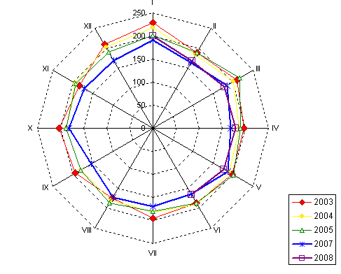 Рисунок 3. Число умерших, по месяцам 2003-2008 годов,