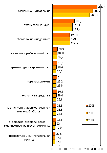 С 2004 по 2006 год число выпускников вузов по специальностям