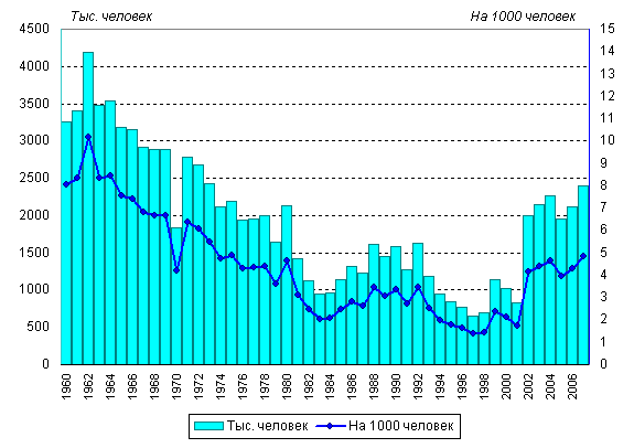 ниже уровня 700 тысяч человек (1,4‰) в 1997-1998 годах.