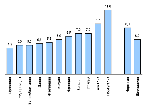 по странам ЕС от 4,5 в Ирландии до 11 в Португалии, составляя в