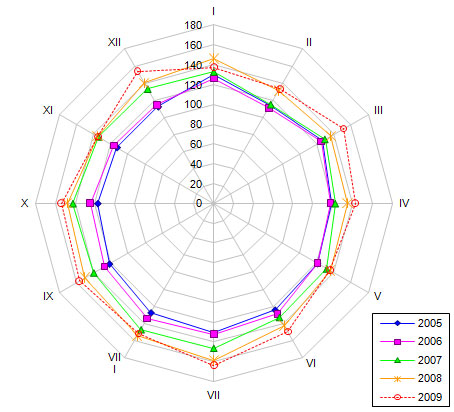 пришлось на июль - август, в 2004 году - на март и ноябрь, в 2005-2007