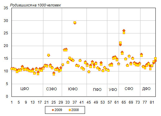 В 40 регионах общий коэффициент рождаемости в 2009 году