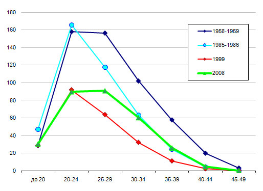всех возрастных группах, начиная с 25-29 лет. В середине 80-х годов