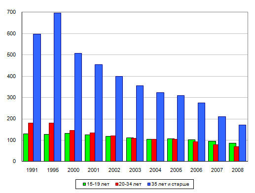возрастных групп, 1991, 1995, 2000-2008 годы