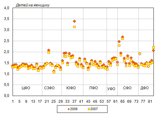 Российской Федерации, 2007 и 2008 годы, детей на женщину