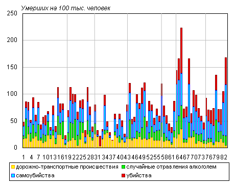 до 35 в Тыве; от убийств - от 1 в Чечне до 85 в Тыве; от самоубийств