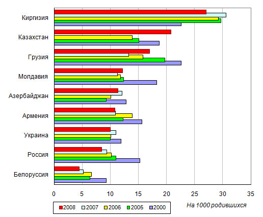 на 10 тысяч родившихся живыми в Белоруссии до 172 в Киргизии, или