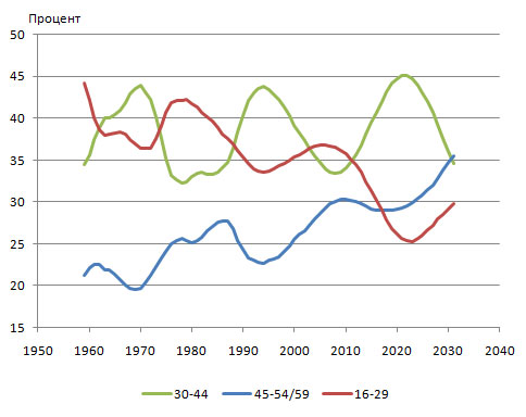 в рабочих возрастах сравняются, а затем младшая группа впервые уступит