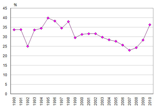 снижается – с 34,0% в 2003 году до 32,9% в 2008-2009 годах.