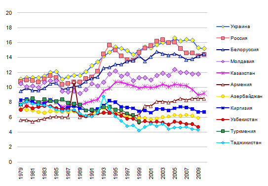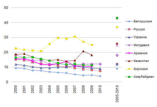 отмечалось и заметное снижение (на Украине, в Казахстане, России).
