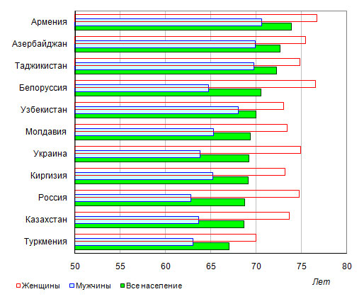 составляет от 62,8 года в России до 70,6 года в Армении, а для женщин