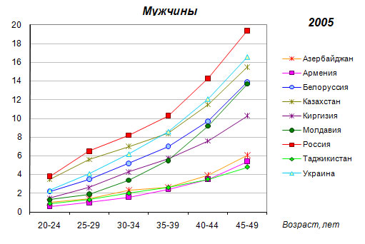 Киргизии и 40-44 лет в Армении, где она относительно невысока по