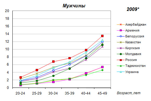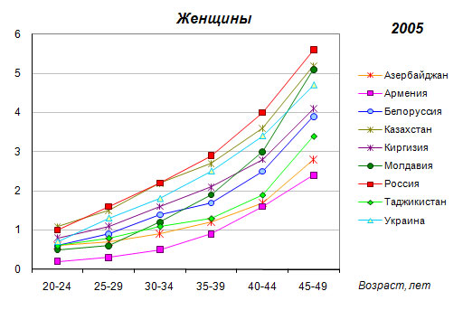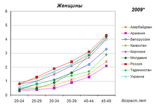 40-44 и 45-49 лет) и Казахстане (на треть в группах 20-24 и 25-29
