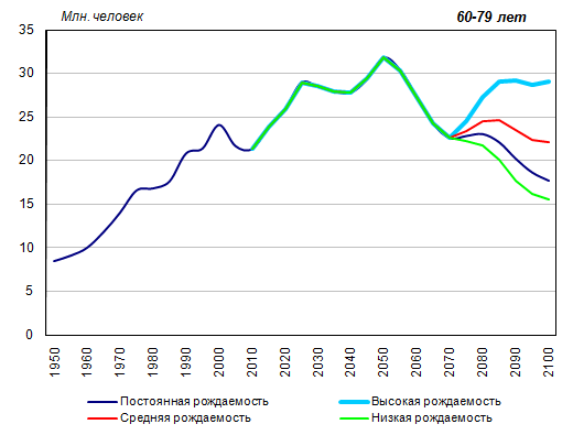 в возрасте 60-79 лет по четырем вариантам прогноза, 1950-2100 годы