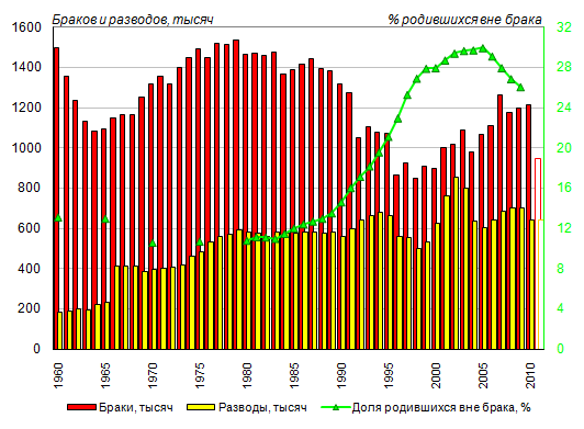 в России (тысяч) и доля родившихся вне брака (%), 1960-2011* годы