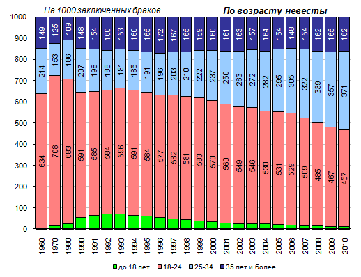 в которых невеста была моложе 25 лет, – с 665 до 466, соответственно.