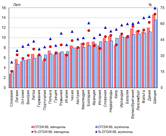 (ОПЗЖ) мужчин и женщин в возрасте 65 лет и ее доля в общей продолжительности