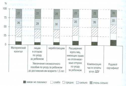 Проведённое исследование доказало, что о мерах правительства в сфере семейной политики лучше осведомлены наиболее образованные и наиболее обеспеченные респонденты средних лет. Самый высокий уровень информированности о демографической программе государства наблюдается у лиц 30-39 лет, имеющих высшее образование и доходы не ниже среднего уровня. Именно в этой группе можно ожидать осознанную, рационализированную реакцию на усиление государственной поддержки семей с детьми. Вместе с тем, беря во внимание карьерные устремления  и специфику жизненных приоритетов данной категории населения, у меня вызывает определённые сомнения, что они действительно готовы откликнуться на комплекс мер, предложенный российским правительством. Однако не вызывает сомнений, что эффективность предпринимаемых государством мер в любой области (и сфера поддержки семей и стимулирования рождаемости не является исключением) напрямую зависят от осведомленности граждан в отношении того, что вообще происходит в сфере семейной политики. Исследователи делают также и другой вывод: данная эффективность также зависят от рисков и глубины бедности домохозяйств12. Несмотря на то что предложенные меры семейной политики прежде всего призваны компенсировать затраты на детей в бедных домохозяйствах, именно там, скорее всего, накопилось больше всего претензий к государству.