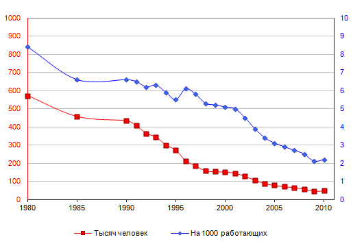 в 1996 году до 15,5 на 100 тысяч работающих. Практически стабильным