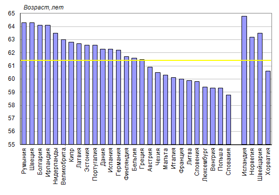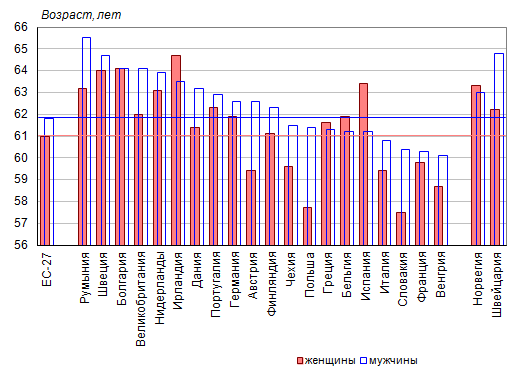 65 лет и более для мужчин в половине стран ЕС-27 и для женщин в