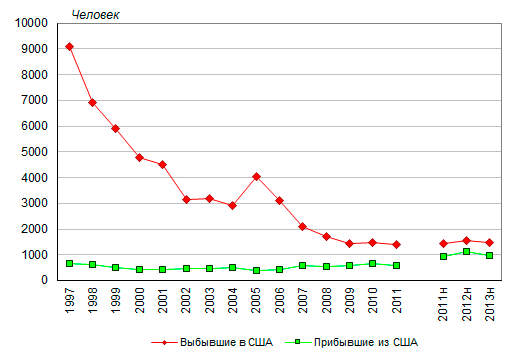 новым правилам учета). В 2012 году число выбывших из России в США
